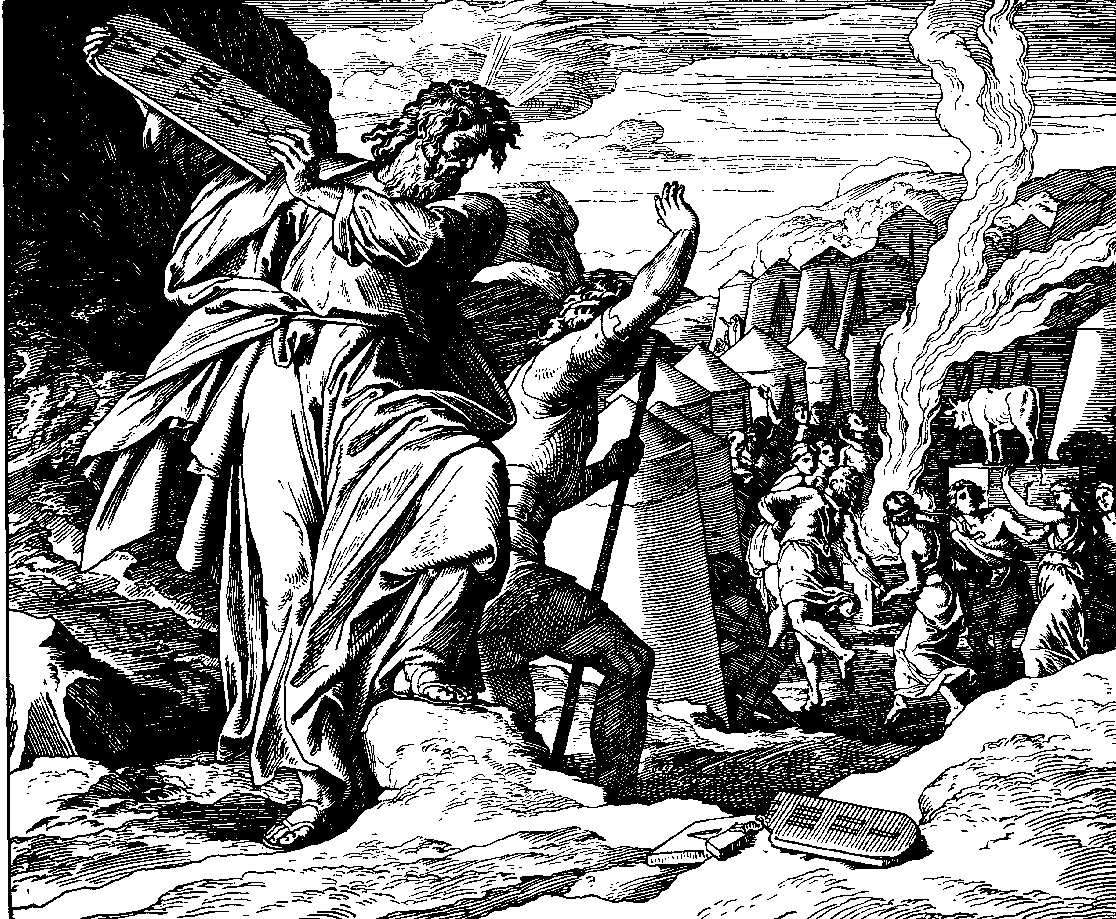 Créditos da Imagem: Moisés quebra as Tábuas dos Dez Mandamentos em resposta à adoração do bezerro de ouro (1860),