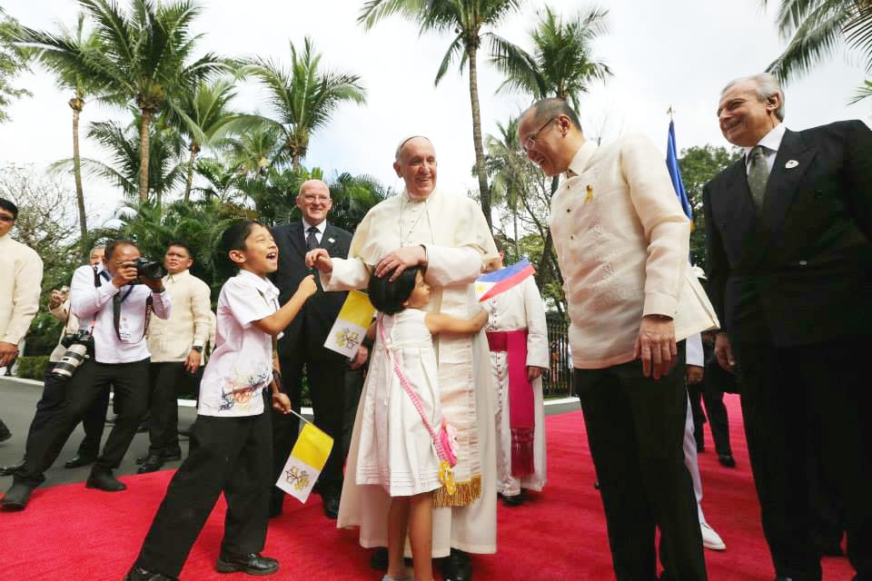 Sua Santidade o Papa Francisco, acompanhado pelo Presidente Benigno S. Aquino III, abraça as crianças no jardim do Palácio Malacañan durante a cerimônia de boas-vindas da Visita de Estado e Viagem Apostólica à República das Filipinas na sexta-feira – 16 de janeiro de 2015). Domínio Público