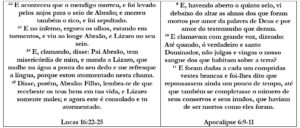 Quando lemos a parábola do rico e do Lázaro (Lucas 16, 19-31), por exemplo, o mendigo é retratado no “seio de Abraão”, separado por um abismo do rico, que queima “em tormento nas chamas” numa outra parte do Sheol (ou Região dos Mortos), mas essa condição não se assemelha à dos mártires após o Advento de Cristo e que clamam por Justiça na visão de S. João no Apocalipse, que não se encontram mais no “Seio de Abraão”, mas debaixo do Altar de Deus (Apocalipse 6,9-10). São sutis diferenças, mas muito significativas. Enquanto Lázaro se encontra consolado por Abraão, os mártires são consolados pelo próprio Deus.